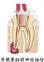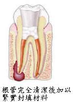 將牙齒內的神經抽除, 藉著X光或牙根長度測量器, 精密的測出每一神經根管的 長度,並予充分擴大後,再 以特殊材料將神經根管做緊 密的封填,如此才能確除病 源,杜絕再發。