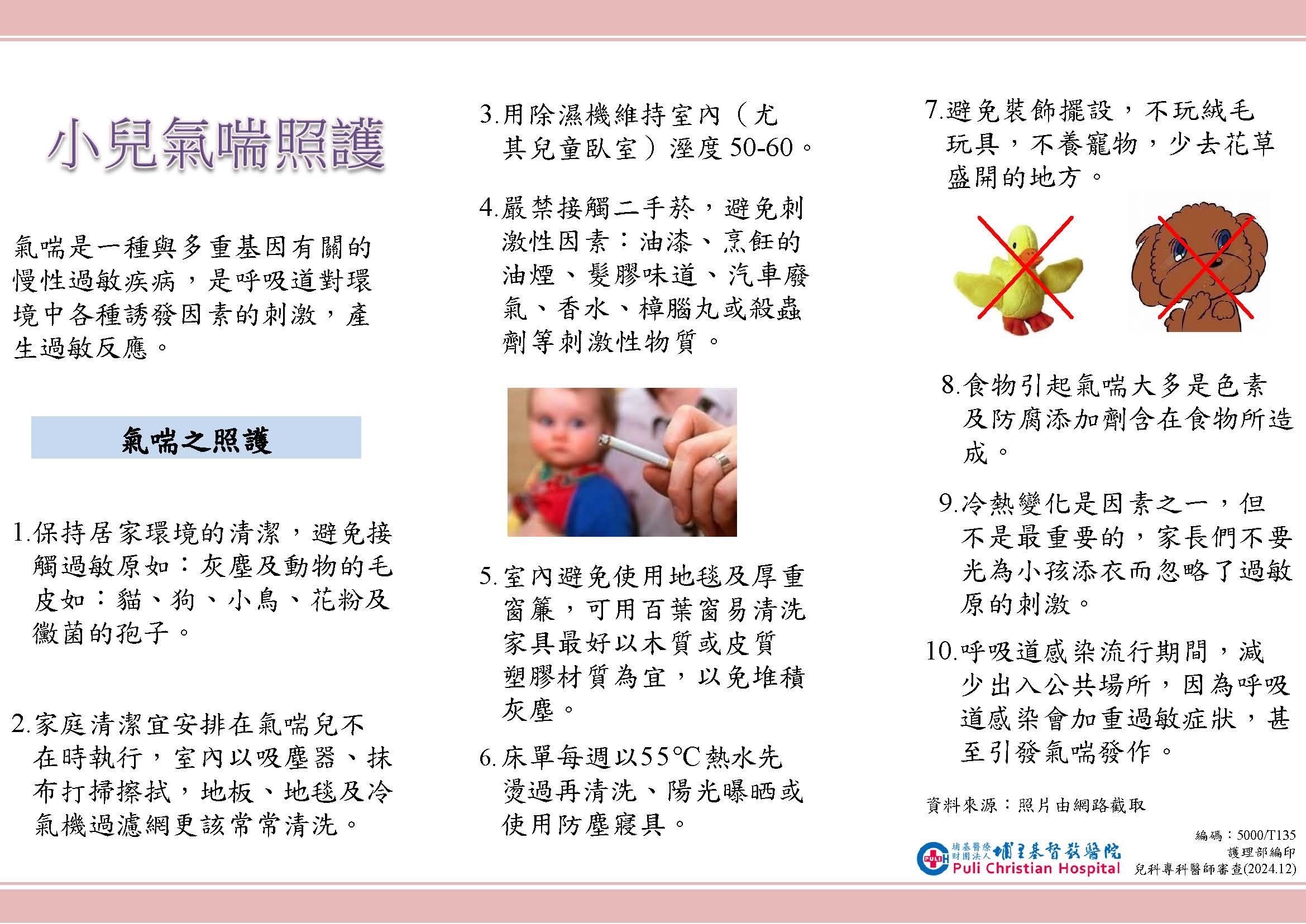 - 保持居家環境的清潔,避免接觸過敏原如:灰塵及動物的毛皮如:貓、狗、小鳥、花粉及黴菌的孢子。