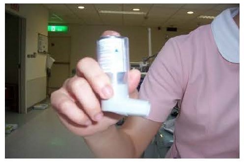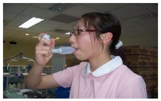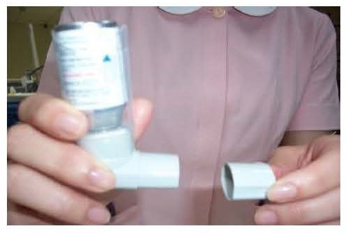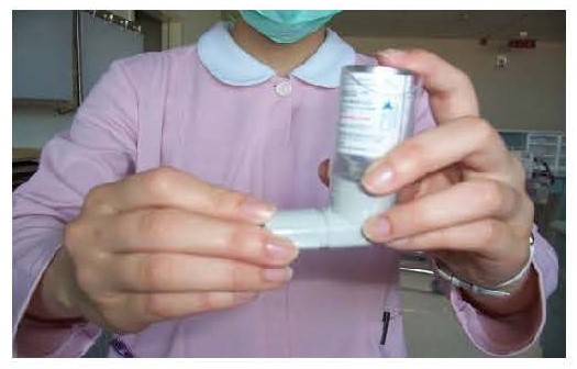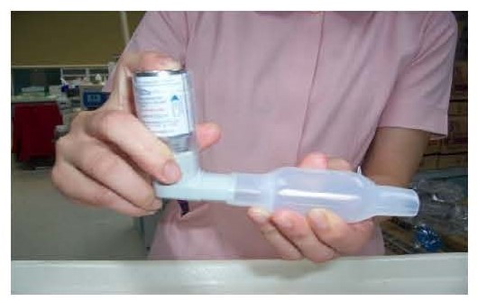 學齡期定量噴霧器使用 移去護蓋。 上下搖動噴霧吸入器。 接上塑膠延伸管。 慢慢呼氣,含住口器,容器頂部朝上,緩慢深吸氣,不可中斷, 並按壓噴霧劑所需的劑量。 移去口器,閉氣 10 秒。 蓋上護蓋。 使用後漱口。