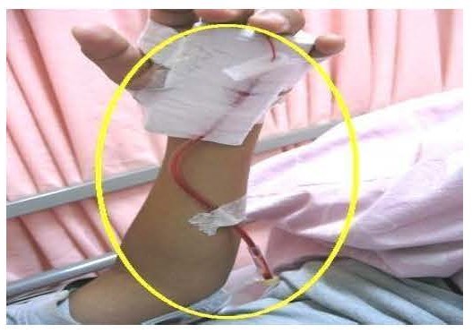 小兒靜脈注射注意事項 注意事項 不可自行調整點滴。 安撫嬰幼兒需要抱高時,請保持點滴瓶高於注射部位, 以維持壓力並避免回血。 注射肢體應避免用力或過度活動, 以避免回血或阻塞。 若點滴管與針頭有脫離情形, 請勿自行接回。 可先關閉點滴並加壓注射部位止血, 並立即通知護理人員處理。 請家屬避免讓病童拉扯管路或咬破管路。 若出現以下情形,請立即告知護理人員: 點滴瓶與點滴管接頭脫落。 注射部位血管出現紅、熱、疼痛。 注射部位末梢出現冰冷、感覺異常、皮膚變色或腫脹。